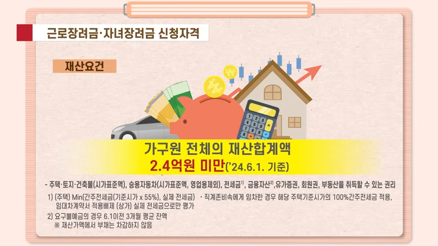 - 가구 재산이 1억 7천만 원 이상 2억 4천만 원 미만인 경우: 지급액의 50%만 수령