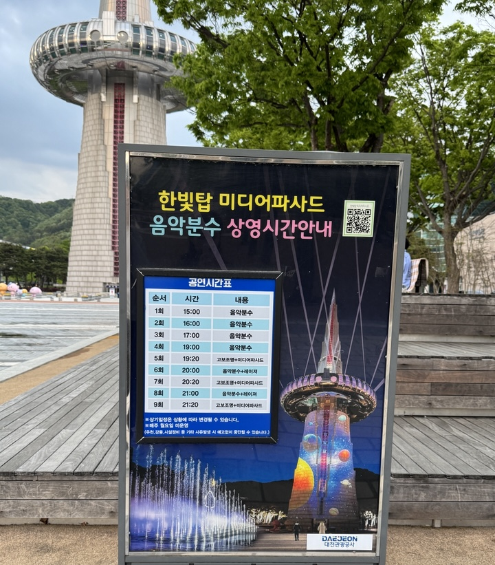 음악분수는 대전 한빛탑의 또 다른 매력이죠. 낮과 밤 시간대에 각각 운영되며, 아래 시간표를 참고하시면 좋아요: