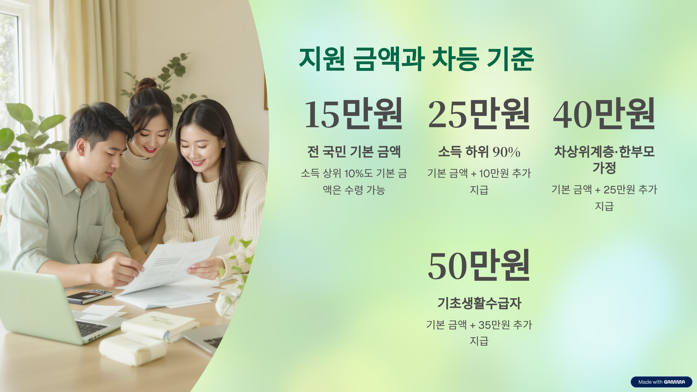 - 소득 하위 90%: 10만 원 추가 → 총 25만 원