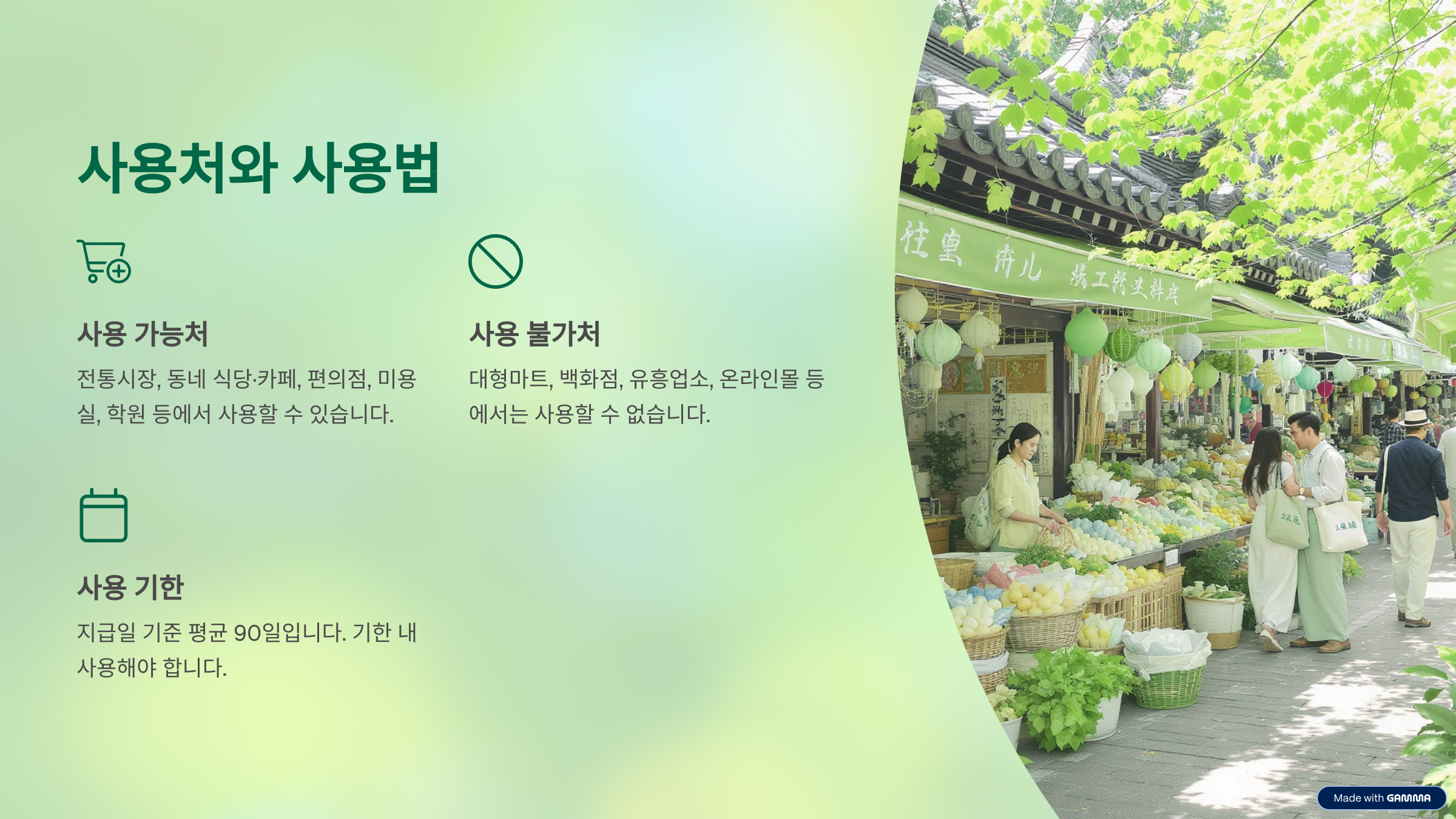 - 사용 불가처: 대형마트, 백화점, 유흥업소, 온라인몰 등