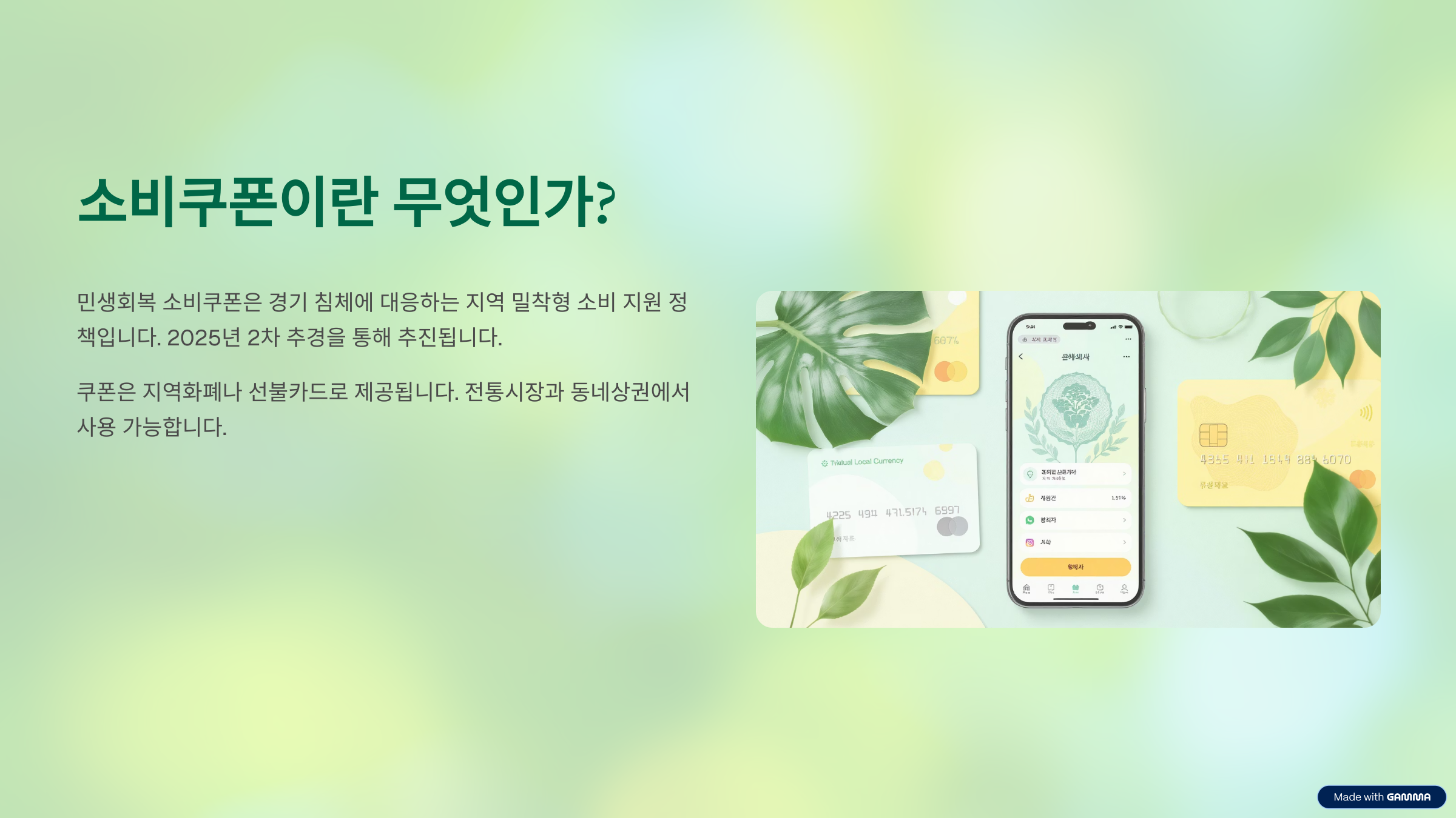 민생회복 소비쿠폰은 경기 침체에 대응해 정부가 2025년 2차 추경을 통해 추진하는 지역 밀착형 소비 지원 정책입니다. 쿠폰은 지역화폐 또는 선불카드 형태로 제공되며, 전통시장·동네상권 등에서 사용할 수 있도록 설계됐습니다. 정책 목표는 단순한 현금성 지원이 아니라, 실제 지역 경제에 돈이 돌게 하는 것입니다.