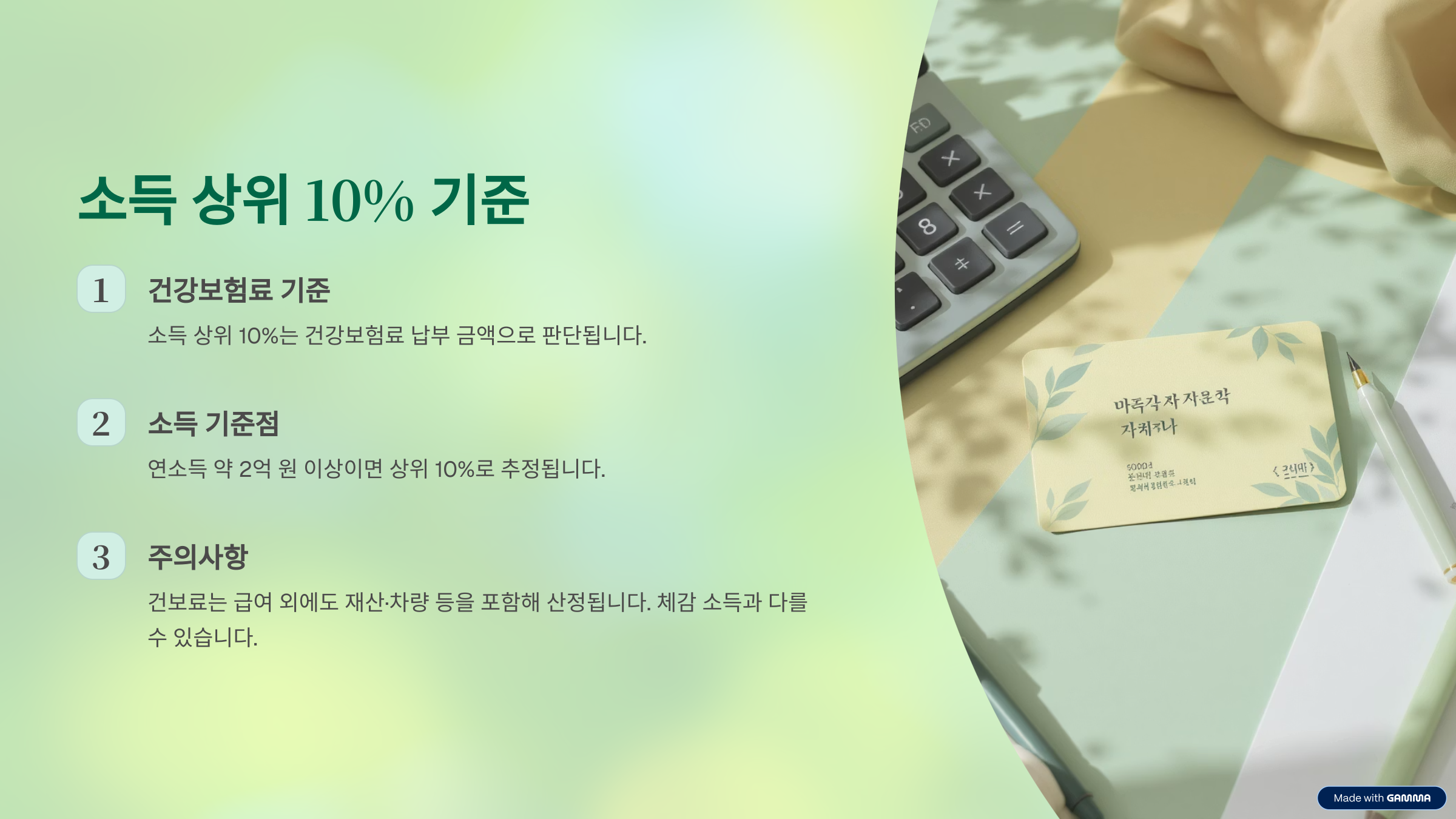 소득 상위 10% 기준은 건강보험료 납부 금액으로 판단됩니다. 직장가입자와 지역가입자 모두 국민건강보험공단 앱이나 고지서를 통해 월 납부액을 확인할 수 있으며, 보통 연소득 약 2억 원 이상이면 상위 10%로 추정됩니다.