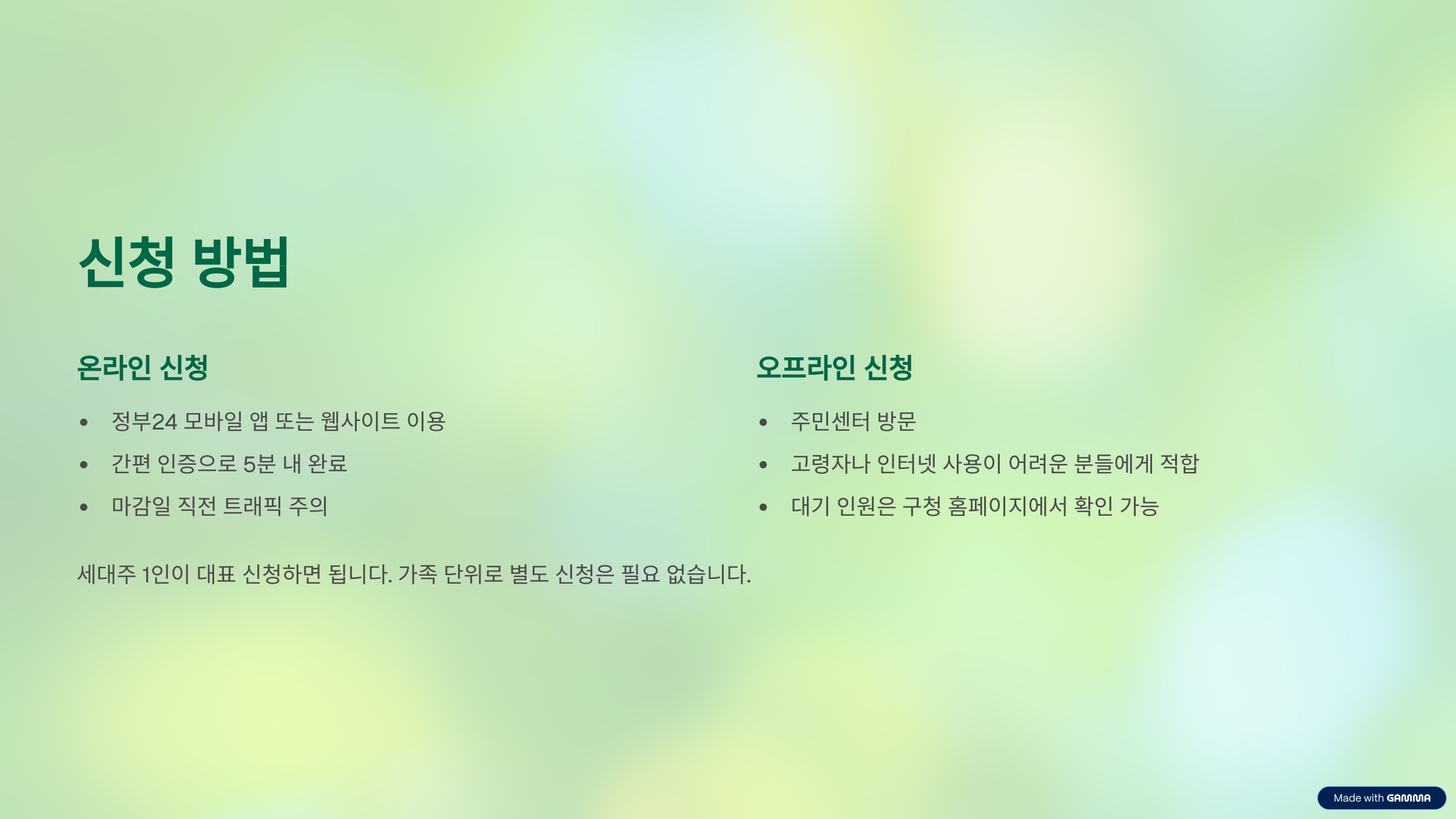 - 온라인 신청: 정부24 모바일 앱 또는 웹사이트를 통해 가능하며, 간편 인증으로 5분 내 완료됩니다. 단, 마감일 직전은 트래픽이 몰릴 수 있어 주의가 필요합니다.