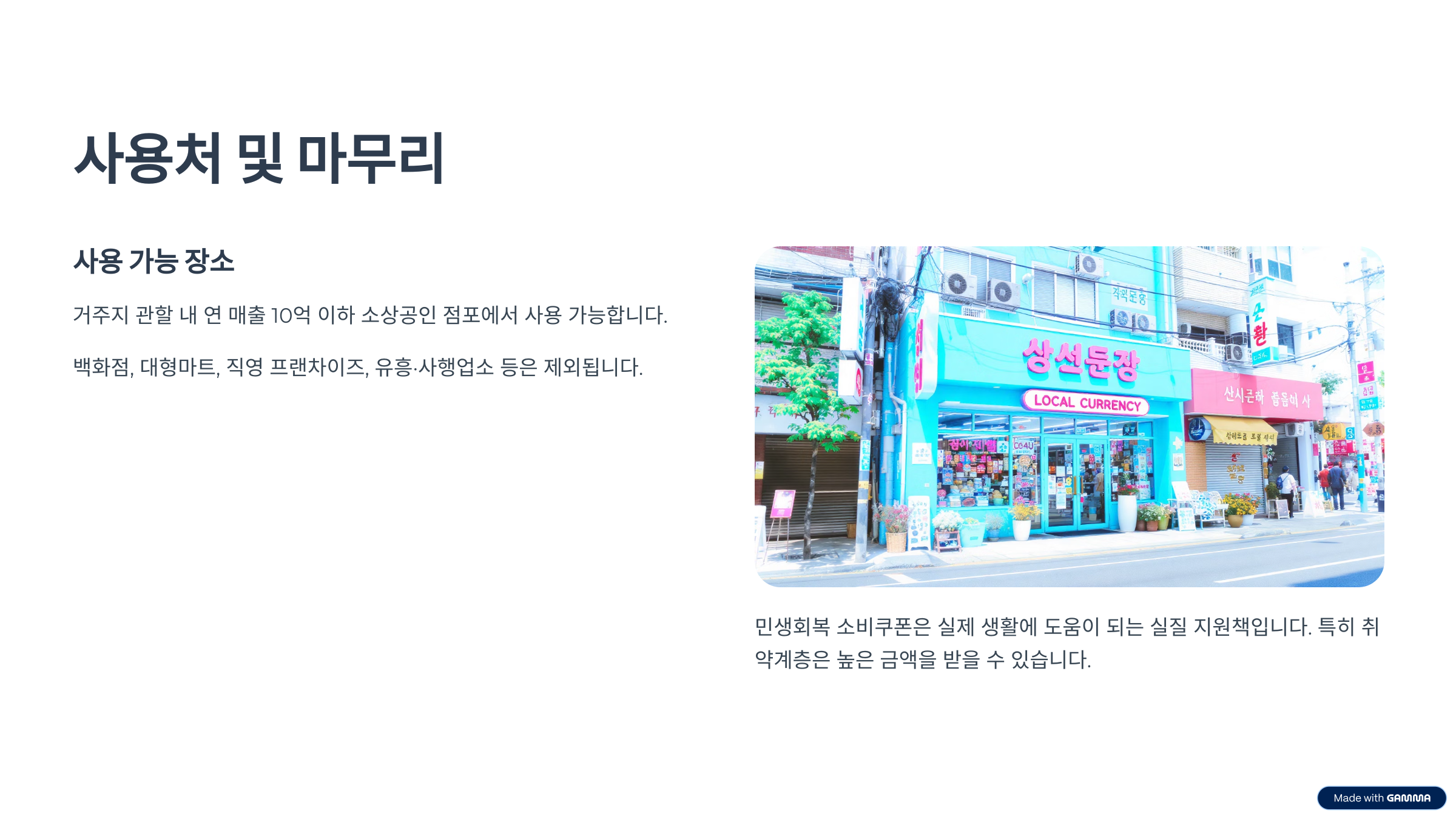 A. 지역화폐 형태로 지급되며, 거주지 관할 내 연 매출 10억 이하 소상공인 점포에서 사용할 수 있습니다. 백화점, 대형마트, 직영 프랜차이즈, 유흥·사행업소 등은 제외됩니다.