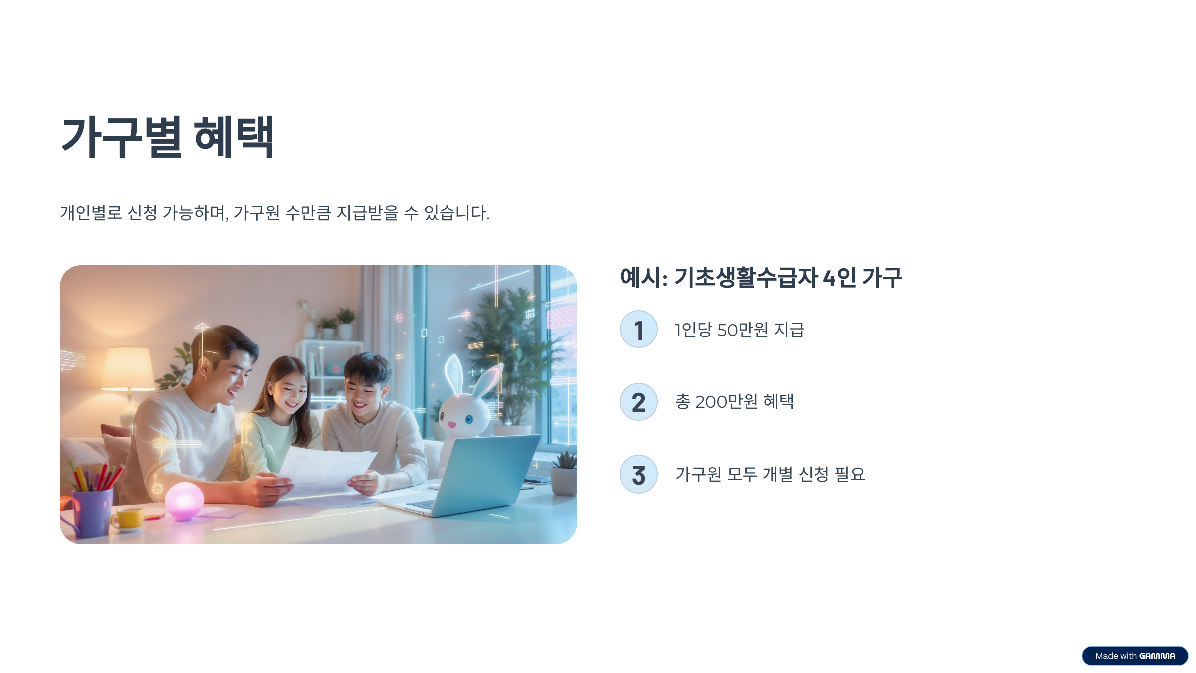개인은 각자 신청 가능하며, 가구원 수만큼 지급받을 수 있습니다. 예를 들어, 기초생활수급자 4인 가구는 총 200만원을 받을 수 있습니다.