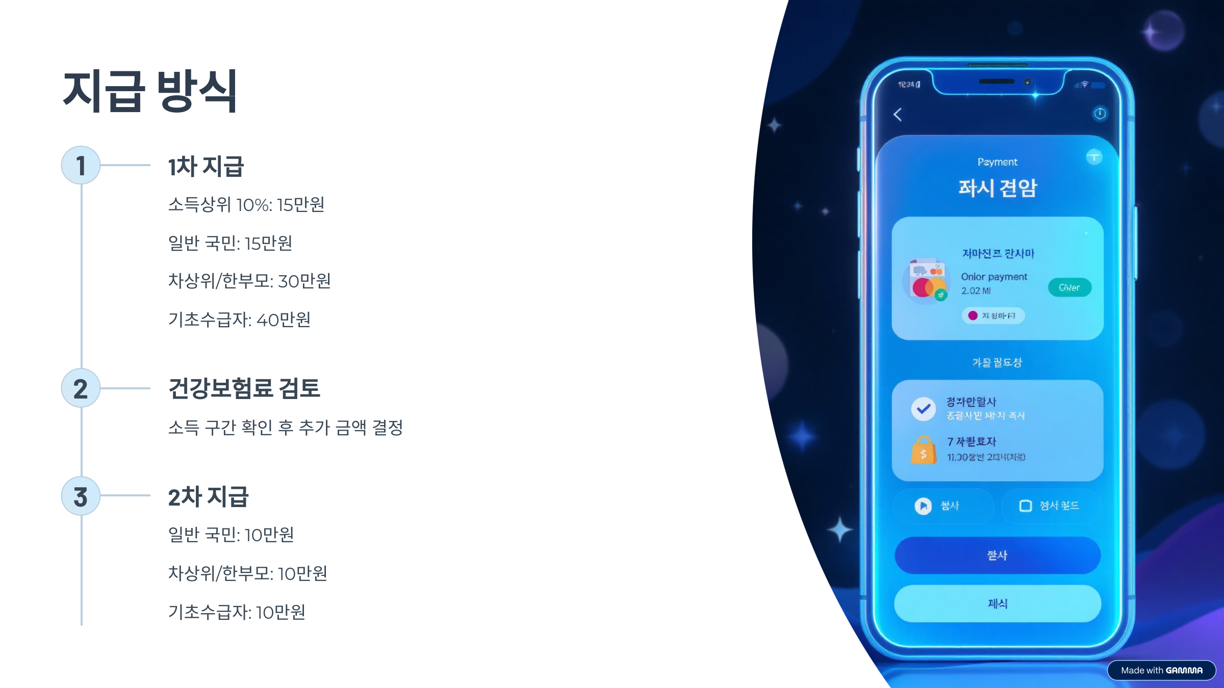 - 기초생활수급자는 1차 40만원 + 2차 10만원 = 총 50만원