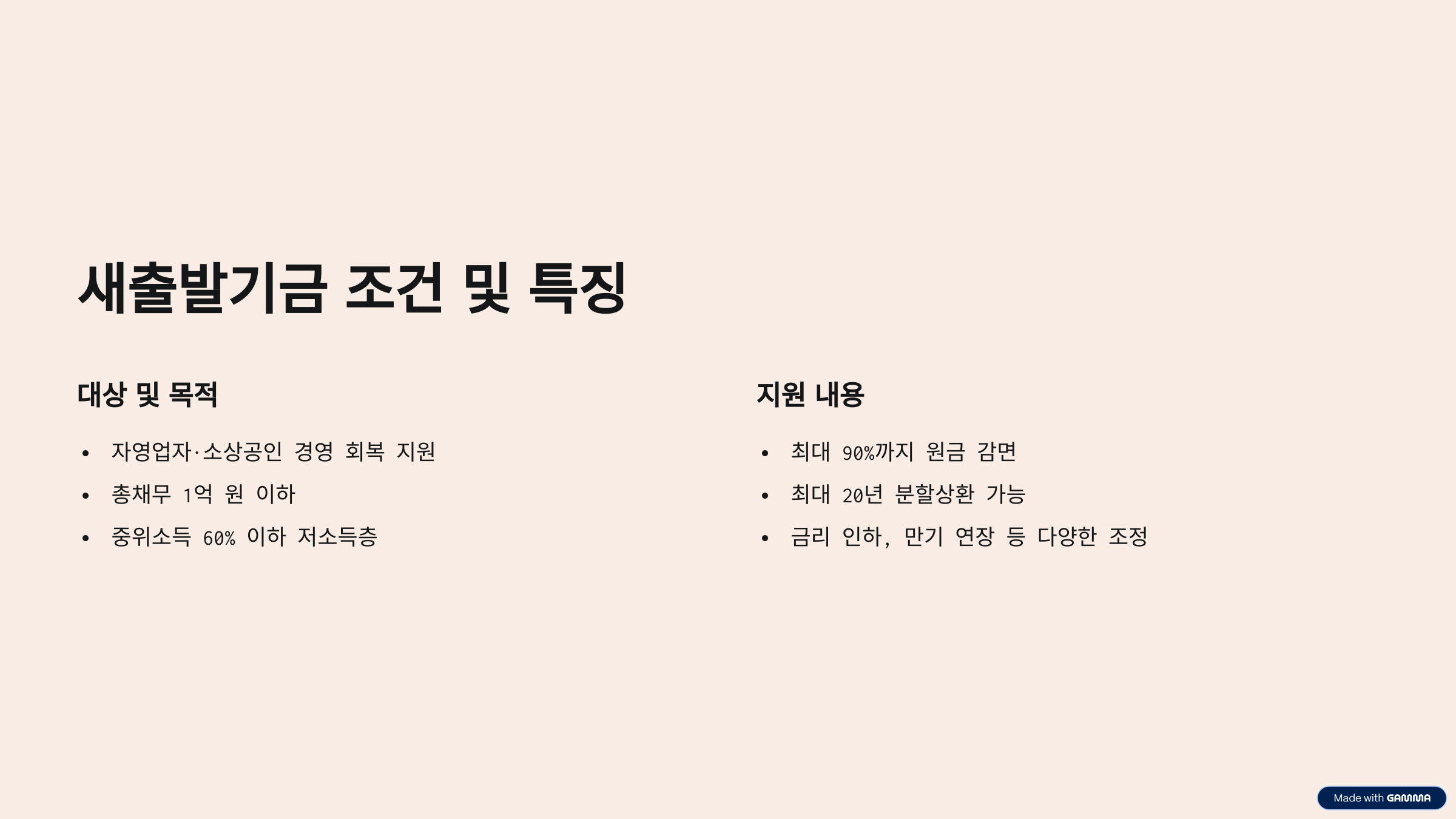 새출발기금 조건은 상황에 따라 최대 90%까지 원금을 감면받을 수 있고, 분할상환 기간도 최대 20년으로 유연하게 조정이 가능해요. 게다가 금리 인하, 만기 연장 같은 다양한 조정 수단이 함께 제공돼요.