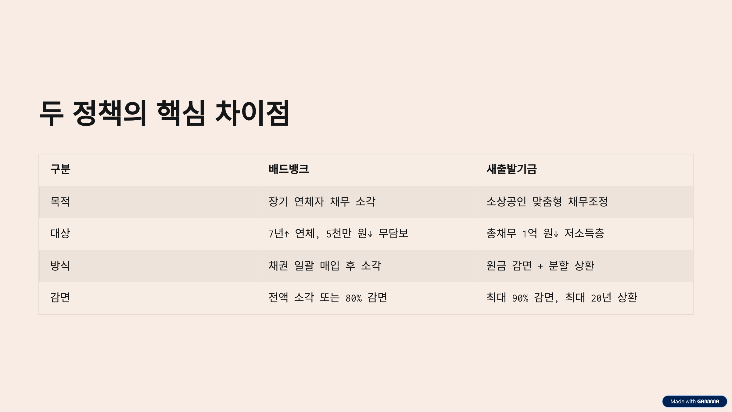 | 감면 | 전액 소각 또는 80% 감면 | 최대 90% 감면, 최대 20년 상환 |