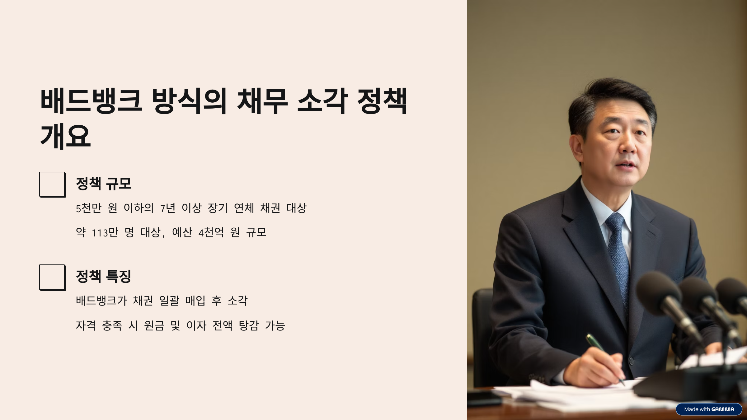 이번 정책은 ‘개별 신청 → 심사 → 채무조정’이 아닌, 정부가 직접 채권을 매입해 소각하는 방식이에요. 속도와 대상 범위 확대에 초점을 맞췄다는 것이 특징이에요.