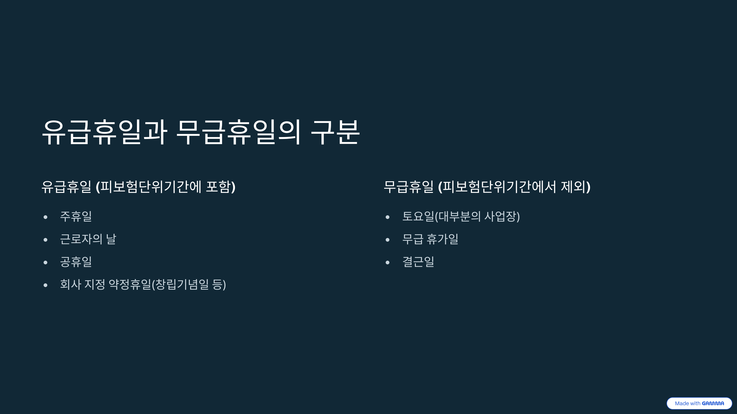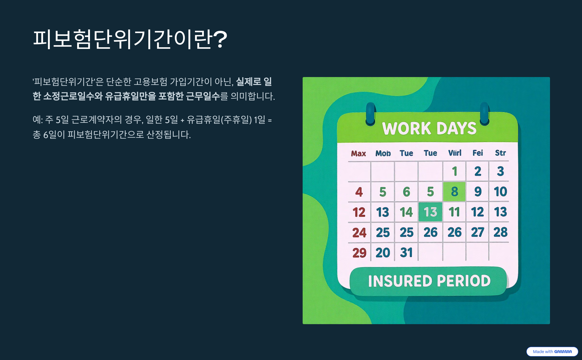 ‘피보험단위기간’이란 고용보험 가입기간 전체가 아닌, 실제로 일을 한 소정근로일수와 유급휴일만을 포함한 근무일수를 의미해요.