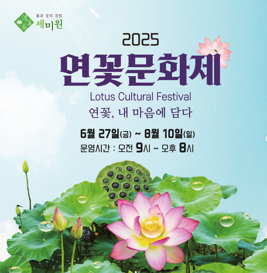 경기도 양평에 위치한 세미원은 '물과 꽃의 정원'으로 유명한 곳입니다. 2025년 연꽃문화제는 6월 27일부터 8월 10일까지 개최되며, 다양한 품종의 연꽃과 수련이 순차적으로 개화합니다. 특히 메타세쿼이아 길과 수생식물원, 야외 미술 작품 등 다양한 볼거리가 마련되어 있어 가족 단위 여행객에게 추천합니다. 운영시간은 오전 9시부터 오후 8시까지이며, 입장료는 성인 7,000원입니다.